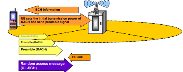 Random access procedure is handled by MAC and PHY Layer through PRACH (in UL) and PDCCH (in DL). RACH carries the preambles and occupies 6 resource blocks in a sub frame. RACH Process is as shown on Figure below: UE selects randomly a preamble from the list of preambles broadcasted in the BCCH then it calculates OLPC parameters (Initial Tx Power) and checks contention parameters (i.e. max. number of retries). After that, UE transmits the initial RACH and waits for a response before retry. Open loop power control ensures that each retry will be at a higher power level. Upon receipt of successful UL RACH preamble, eNB calculates power adjustment and timing advance parameters together with an UL capacity grant (so UE can send more info).