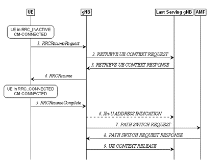 If the UE accesses a gNB other than the last serving gNB, the receiving gNB triggers the XnAP Retrieve UE Context procedure to get the UE context from the last serving gNB and may also trigger an Xn-U Address Indication procedure including tunnel information for potential recovery of data from the last serving gNB. Upon successful UE context retrieval, the receiving gNB shall perform the slice-aware admission control in case of receiving slice information and becomes the serving gNB and it further triggers the NGAP Path Switch Request and applicable RRC procedures. After the path switch procedure, the serving gNB triggers release of the UE context at the last serving gNB by means of the XnAP UE Context Release procedure.