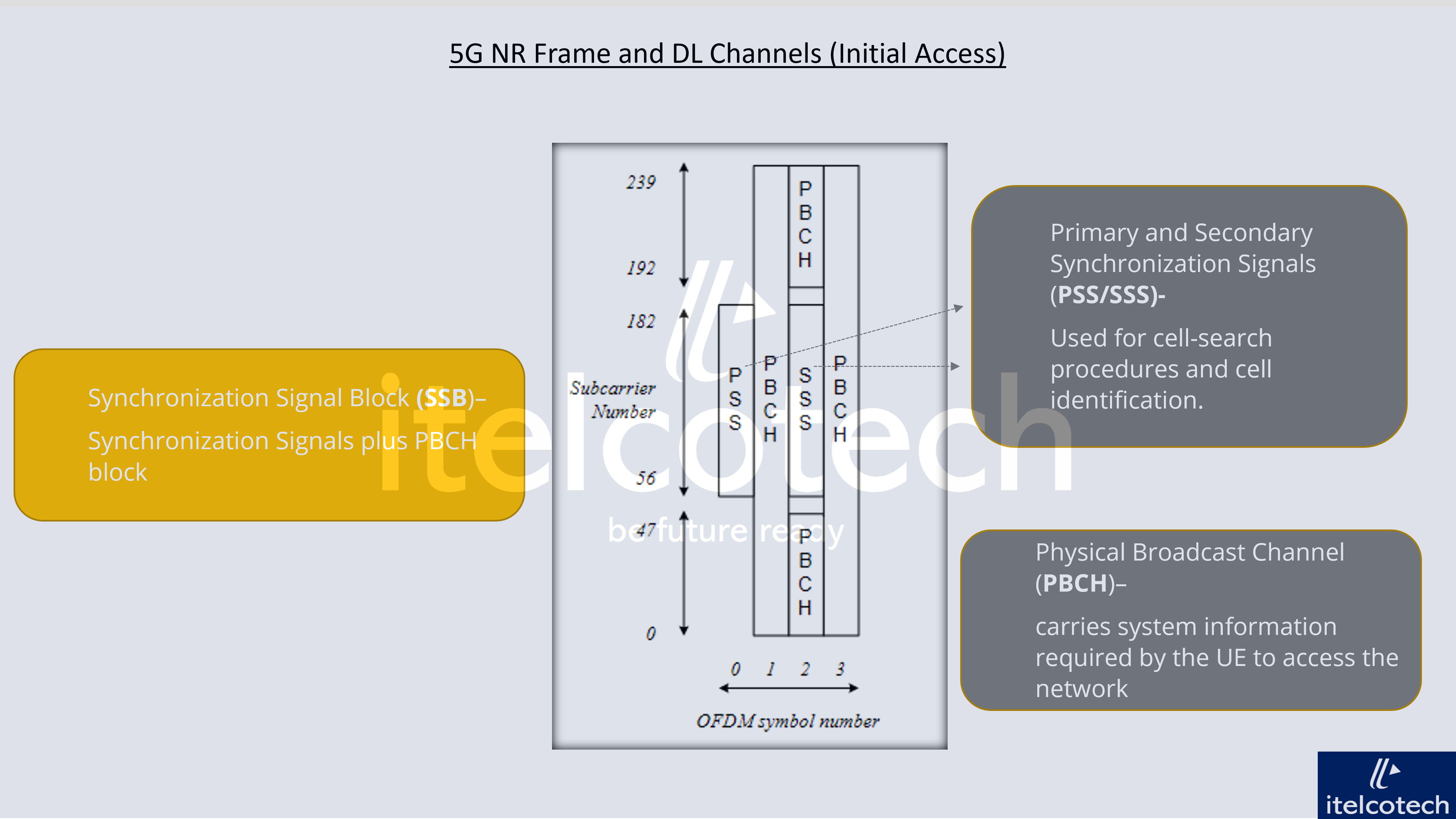 The Synchronization Signal and PBCH block (SSB) consists of primary and secondary synchronization signals (PSS, SSS), each occupying 1 symbol and 127 subcarriers, and PBCH spanning across 3 OFDM symbols and 240 subcarriers, but on one symbol leaving an unused part in the middle for SSS as show in Figure.